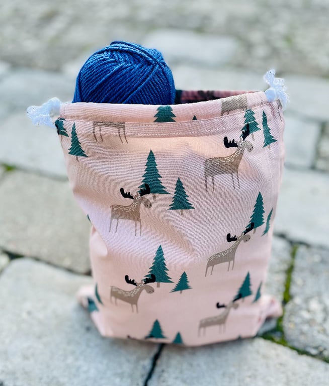 Denne pose er med gammelrosa baggrund med elge i skoven.